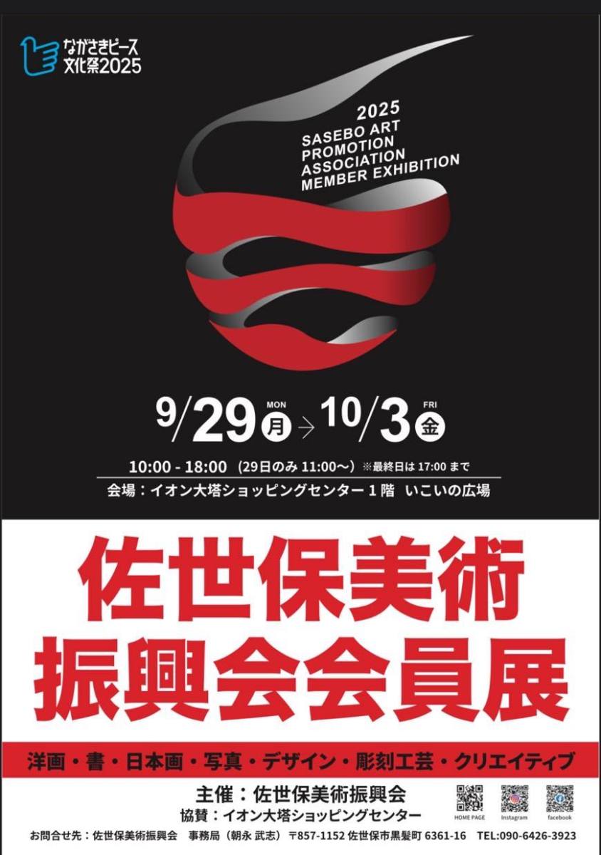 イオン大塔ショッピングセンター1階 いこいの広場にて、佐世保美術振興会会員展を開催しています。お買い物ついで、いや、会員展見学のついでに、ぜひ買い物もしていってください。令和7年9月29日(月)~10月3日(金) 10:00~18:00(最終日は17:00まで) 2025bisinten_poster Image 1 of 1